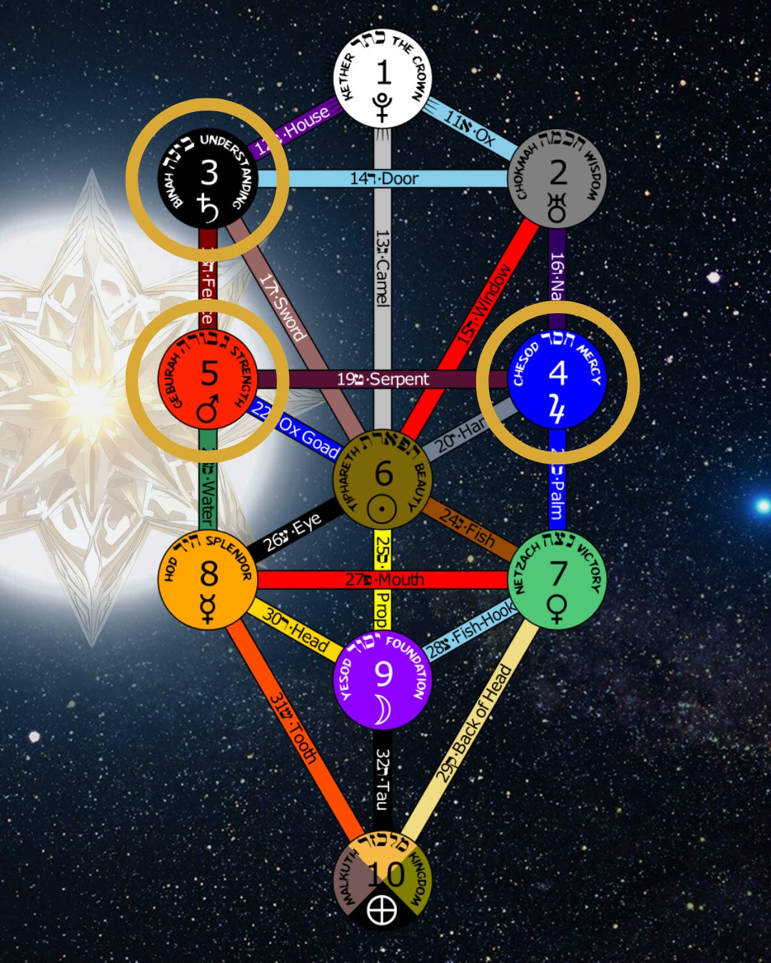 Saturn is also associated with Binah, Sephira 3 on the Tree of Life, the Great Mother and the head of the Pillar of Form (which you can see also includes Geburah). The right-hand Pillar of Force initiates the spark and this left-hand Pillar presses that spark into a shape.